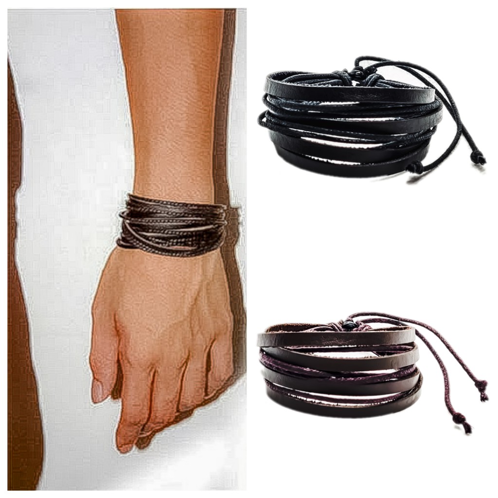 Pulseira bracelete couro voltas couro Preto Ou Marrom Café Masculina Feminina Tribal Pode Molhar Não Precisa Amarrar.