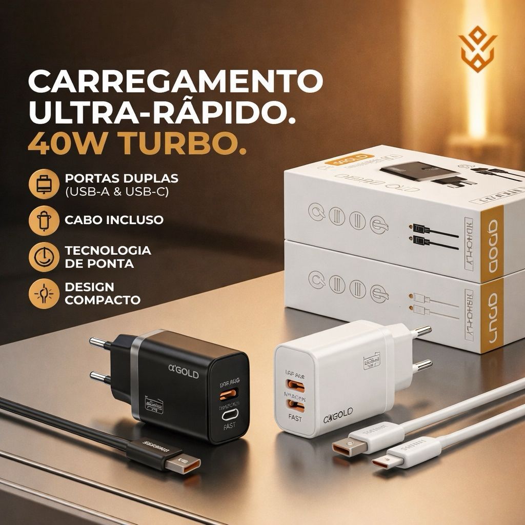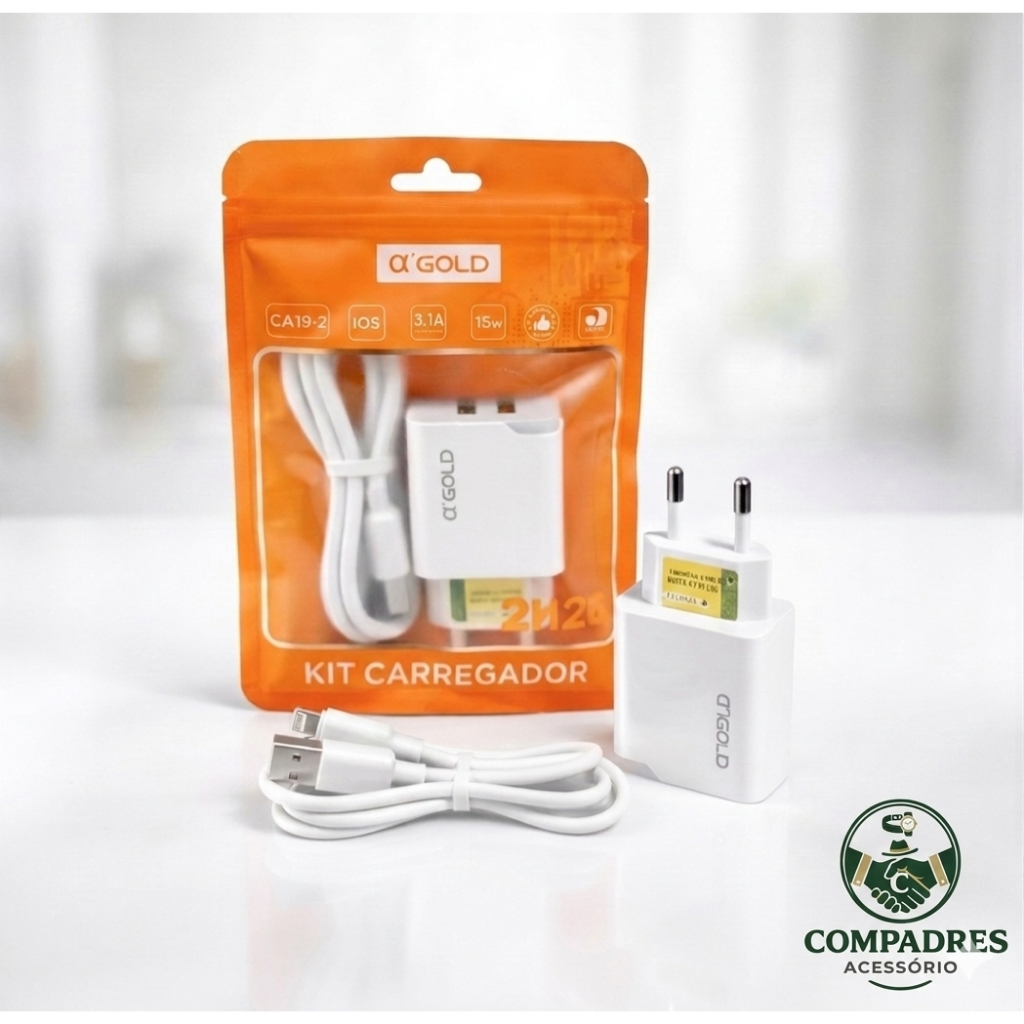 KIT Carregador Turbo 40W A'Gold CA42-3 Charge 4.0 + Cabo USB V8 para iPhone