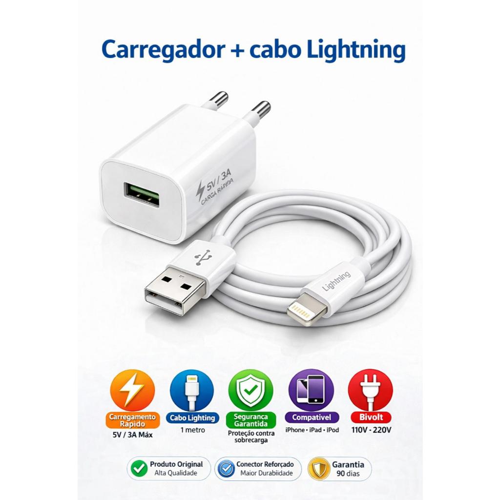 Kit Carregador Lightning IPhone 7, 8, 9, XR, 12, 13 e 14 Pro Max Completo Turbo Carregamento Rápido IOS