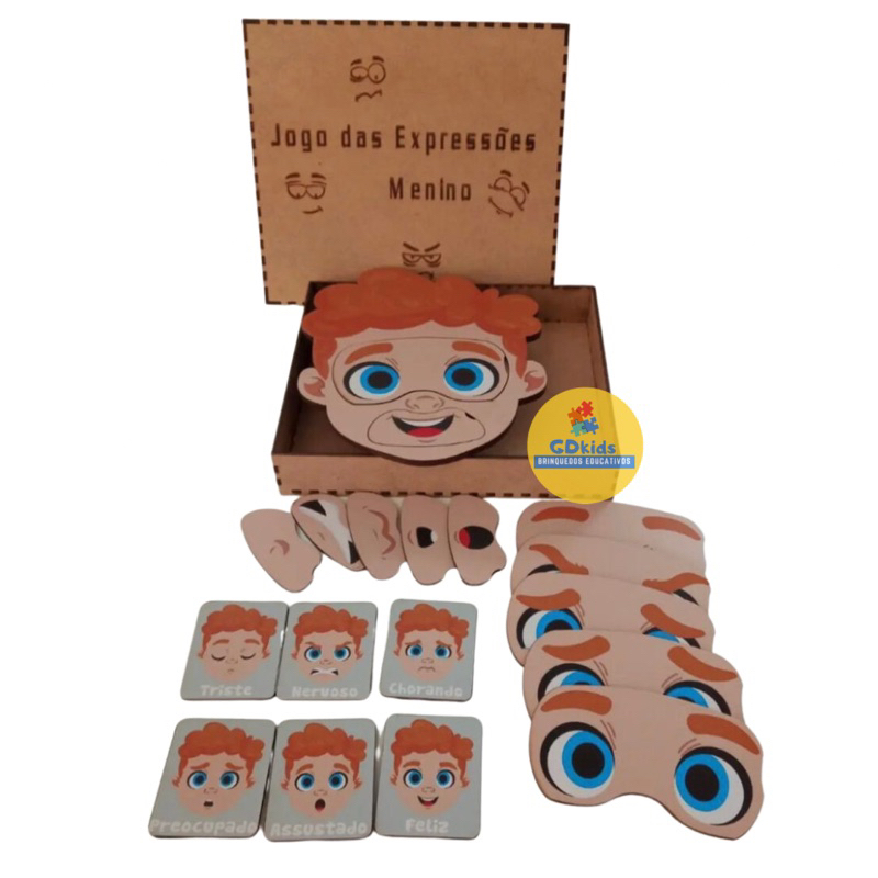 Jogo das Expressões MENINO 18 peças em Madeira Brinquedo Educativo e Pedagógico Sentimentos Emoções