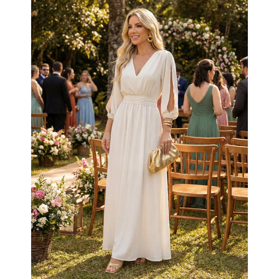 Vestido Feminino Chic Longo Fenda Drape Off White 38 ao 50 Plus Size Noivado Casamento Festa