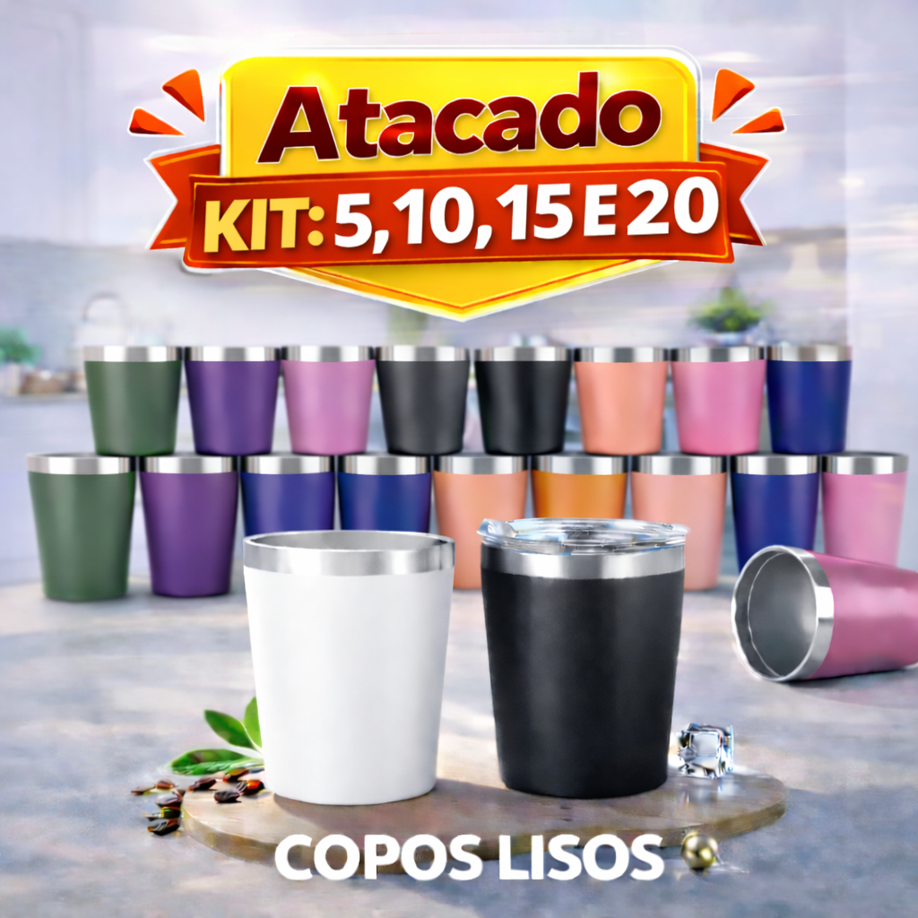 Kit 20 Copos TĂ©rmicos Inox 260ml - LISOS - Atacado Revenda Personalizável - com tampa acrĂlica