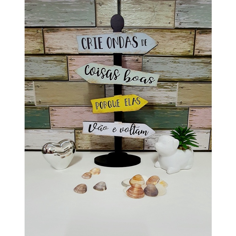 Enfeite de Mesa - Seta " Crie Onda de Coisas Boas, porque Elas vão e Voltam " em MDF Adesivado com Base