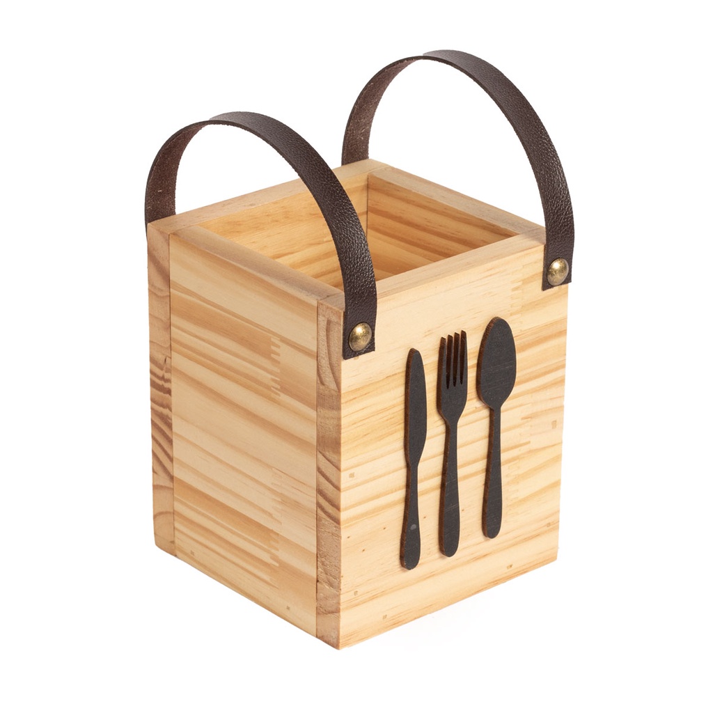 Porta Talher e Utensílios Pinus com Alça de Couro - Mesa Posta - Decoração