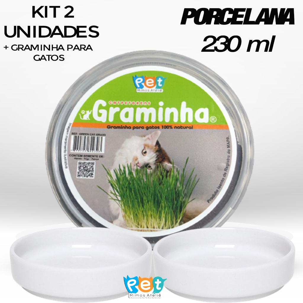 KIT 2 UNIDADES COMEDOURO DE PORCERLANA Para Gatos Raso 230 ml Prato Raso + GRAMINHA