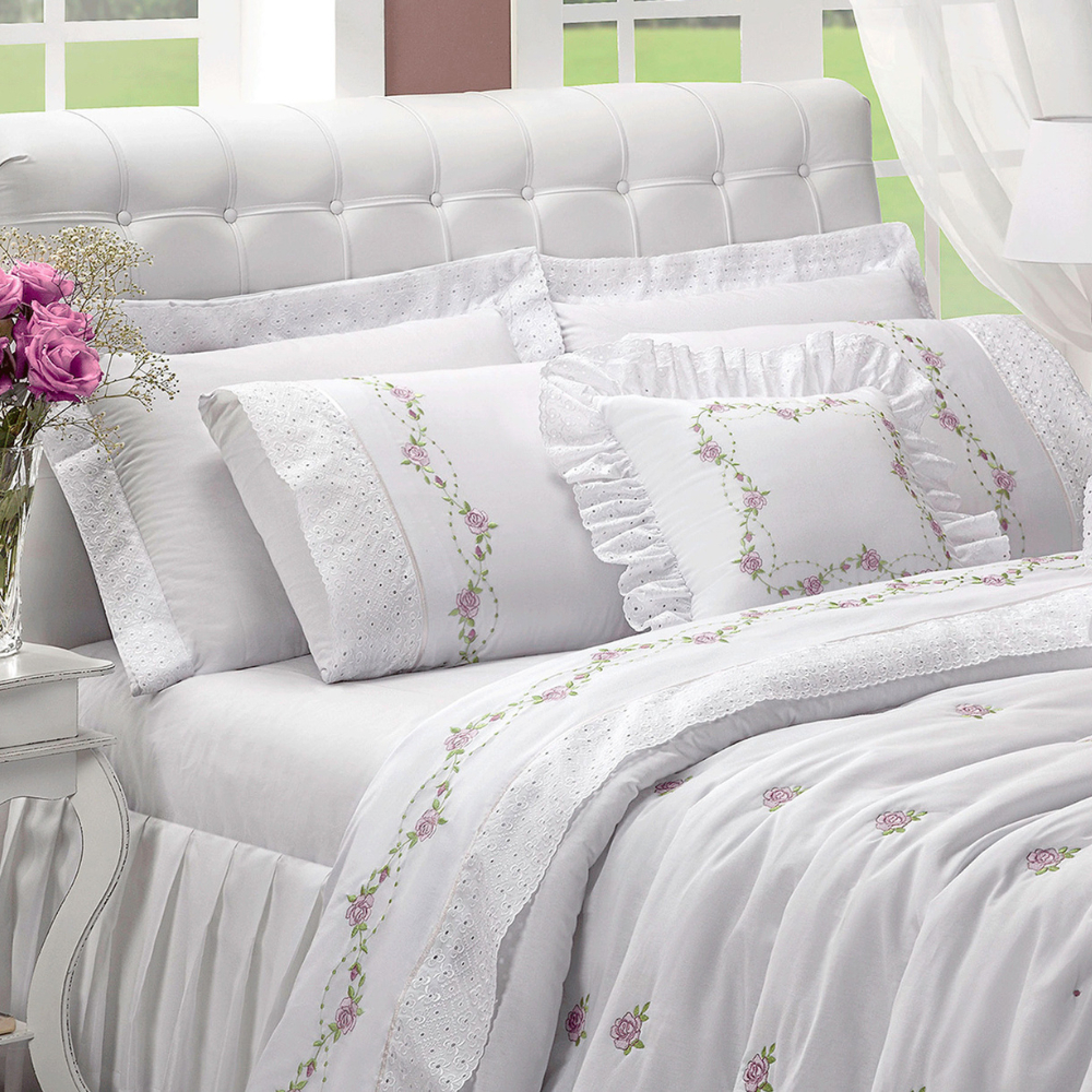 Kit Coordenado Completo Colcha Cobre Leito + Jogo de Lençol Casal, Queen ou King Percal 180 Fios Algodão Bordado Bouquet