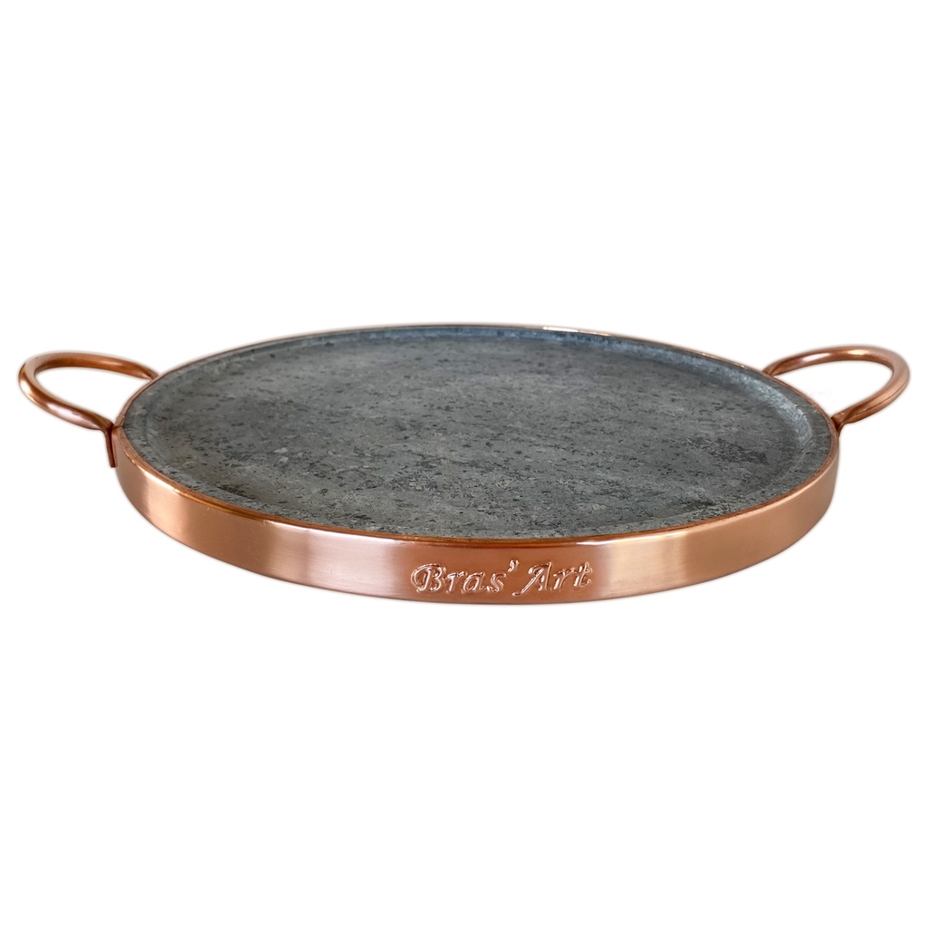 Forma de pedra sabão para pizza com a alça e contorno de cobre 23 centímetros de diâmetro