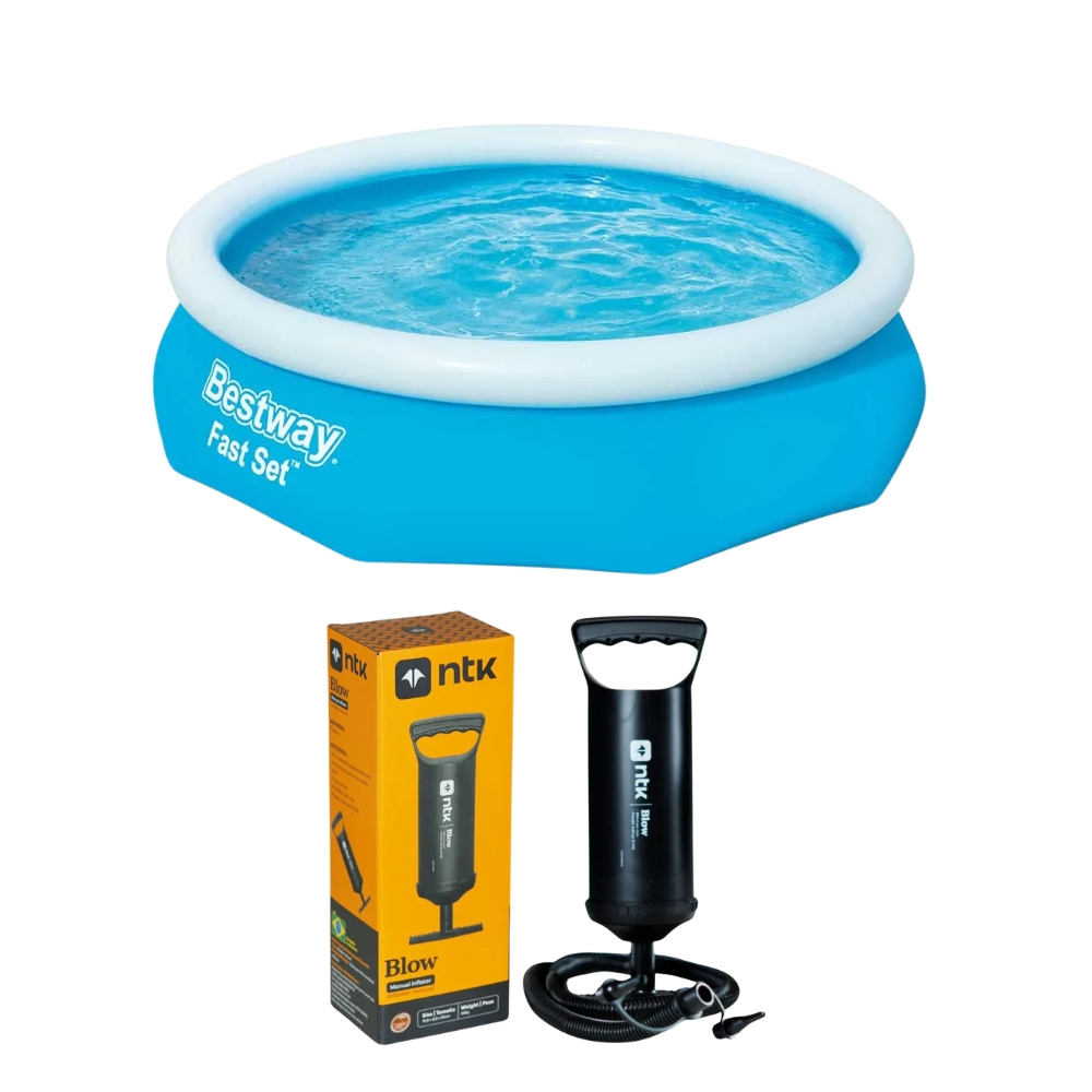 Kit Piscina Inflável Bestway Fast Set 3.800 Litros Azul + Bomba De Ar Manual Blow Com 3 Bicos Adaptadores Nautika