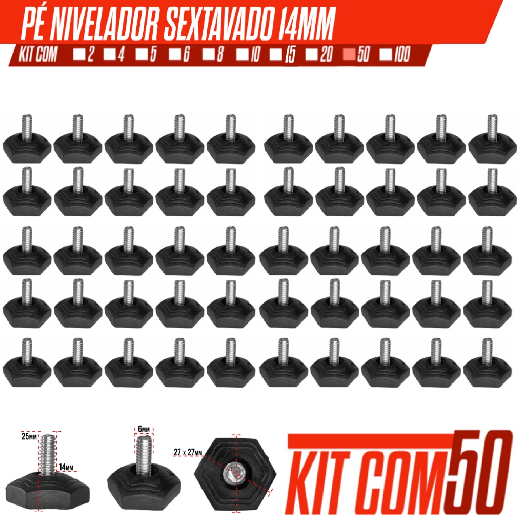 Kit com 50 Peças Pé Nivelador Sextavado 14mm + Bucha reforçada 10mm de alta qualidade para uso geral