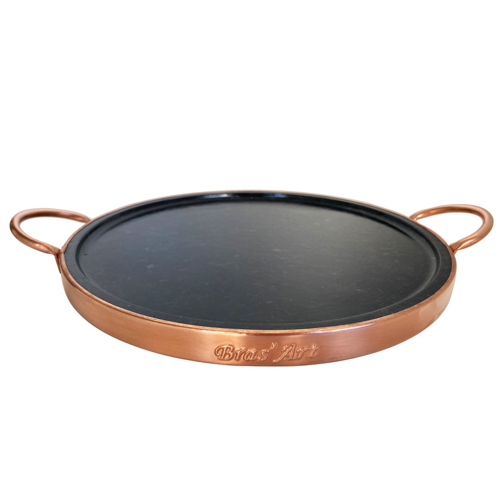 Assadeira de pedra sabão para pizza com alca e contorno de cobre 27 centímetros de diâmetro