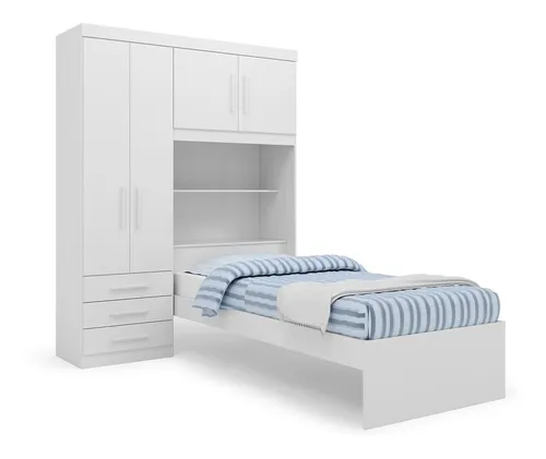 Conjunto Roupeiro Guarda Roupa de Solteiro com Cama Cabeceira com Baú Av