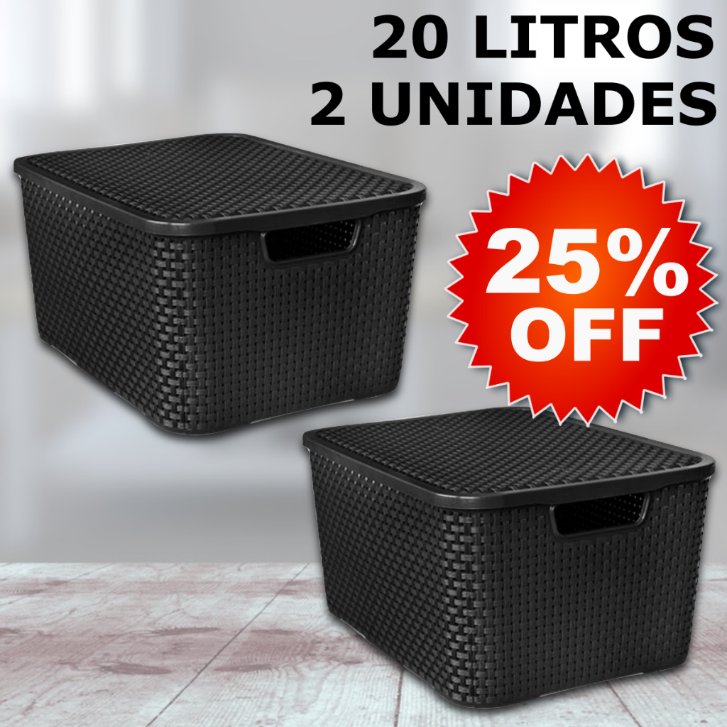 Kit 2 Caixa / Cesta Organizadora Grande 20 Litros Empilhavel Rattan Preta - Cesto Organizador 20L Para Guardar Coisas , Brinquedos