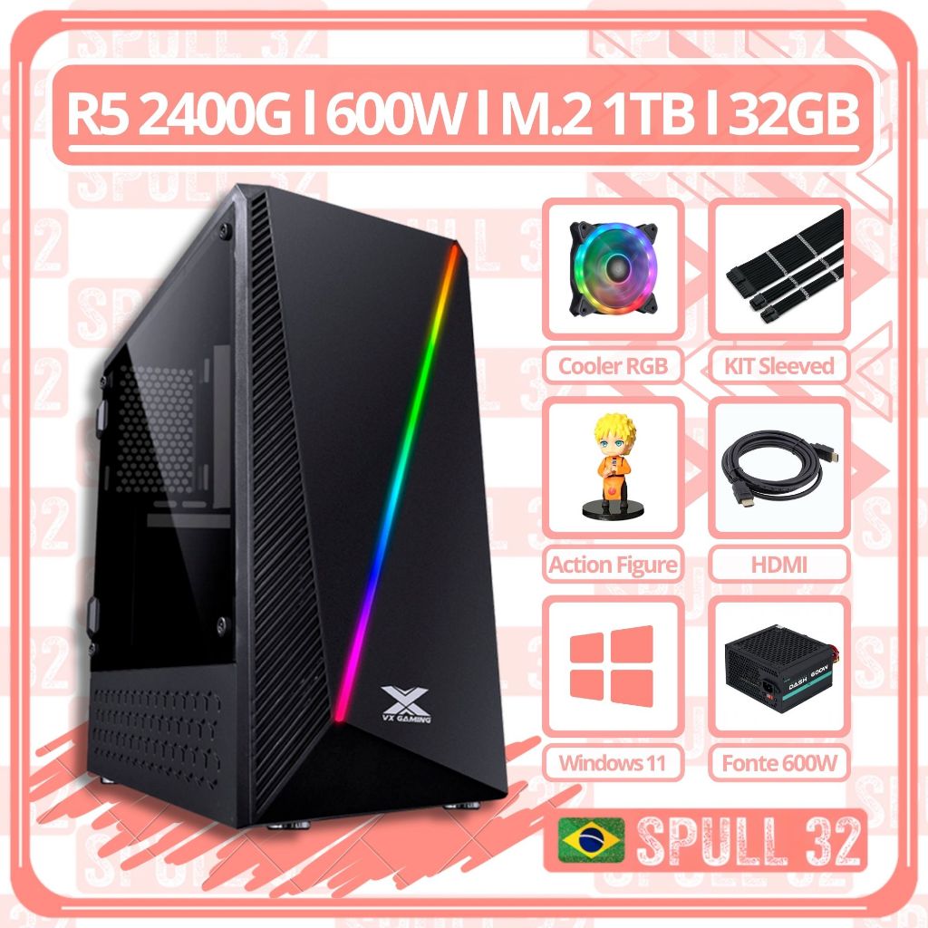 CPU PC Computador Gamer: AMD Ryzen 5 Pro 2400G Ram 32GB RGB M.2 1TB Sleeved 400W | SPULL 32