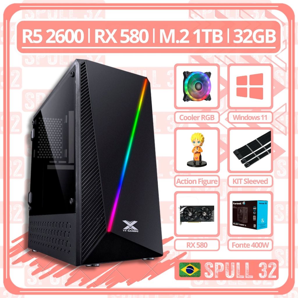 CPU PC Computador Gamer: AMD Ryzen 5 2600 RX 580 Ram 32GB RGB A520M M.2 1TB 400W | SPULL 32