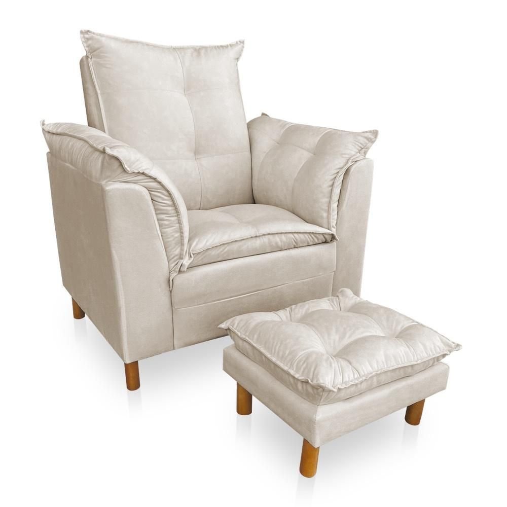 Combo Poltrona Decorativa Opalla Mais Puff Pés Palito Suede Bege - DS Estofados