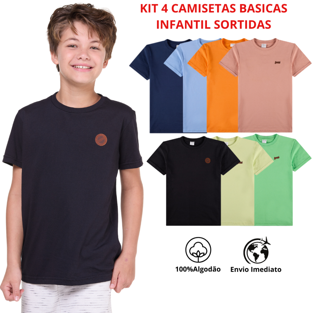 Kit 4 Camisetas em Meia Malha Premium Juvenil e Infantil Básica com Aplique Tamanho 2 ao 16