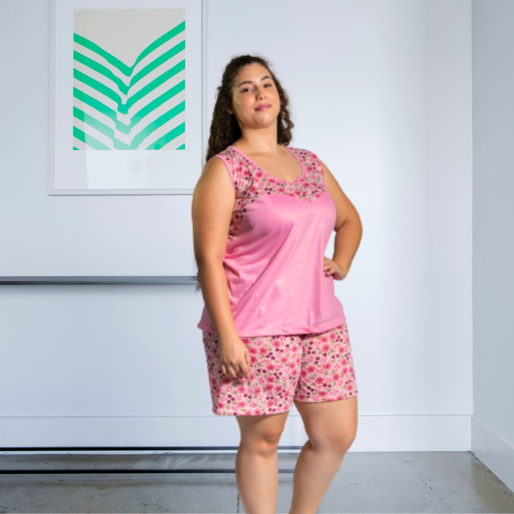 Pijama Bermuda Plus Size Sem Manga Com Detalhe Estampado Na Blusa