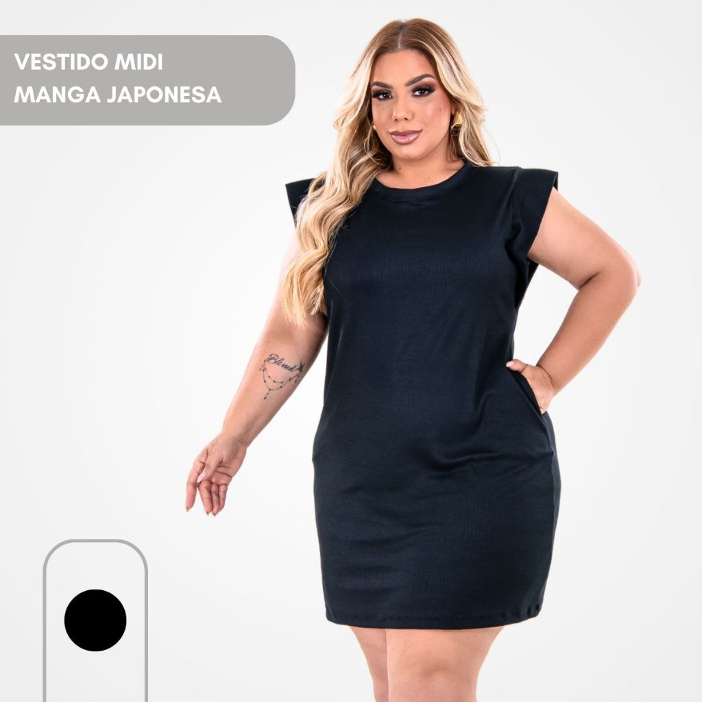 Vestido Preto Plus Size Feminino Manga Curta Com Bolso Curto Estiloso