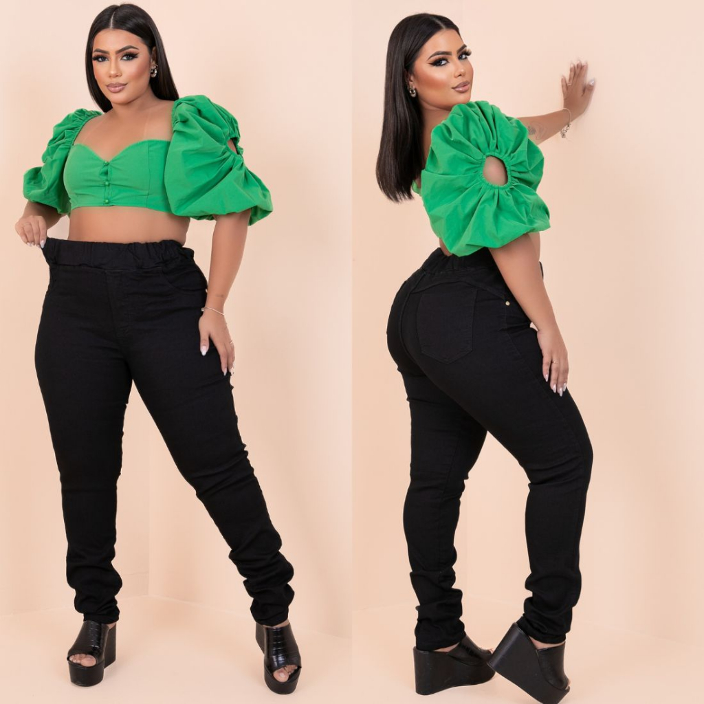 calça jeans preta skinny cintura alta tamanho grande plus strech com elastano elástico no cós muito confortável