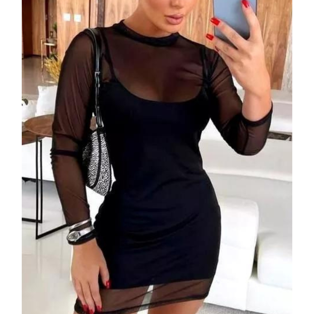 Vestido tule transparente curto manga longa de festa e balada