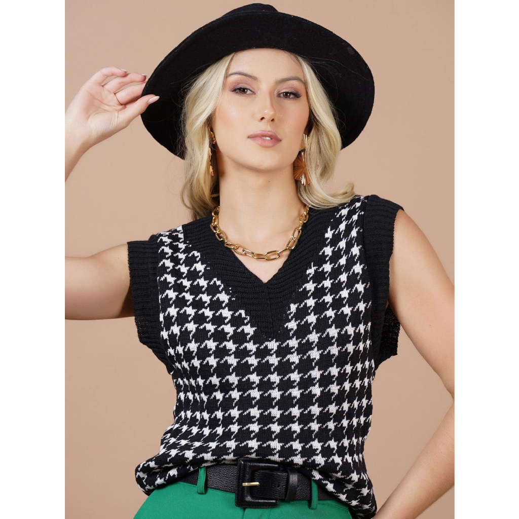 Colete Suéter de Xadrez / Pata de Galo elegante Top de malha/Gola v /sem camisa de baixo/REGATA/MODA INVERNO/Tricot 10020
