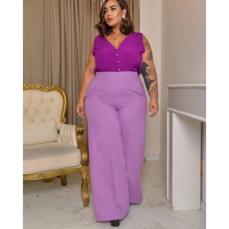Calça Pantalona Wide Leg Feminina Alfaiataria Em Linho Com Botões Social