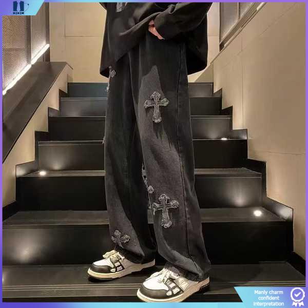 calça cargo jogger masculina calça cargo feminina Calça jeans vertical bordado cinza preto Calça da cruz do outono High Street American Hiphop Calça de trabalho reto