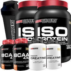 Kit 2x Whey Protein Isolado Bodybuilders Baunilha e Chocolate -900g + 2x BCAA 100g + 2x Creatina 100g + Coqueteleira