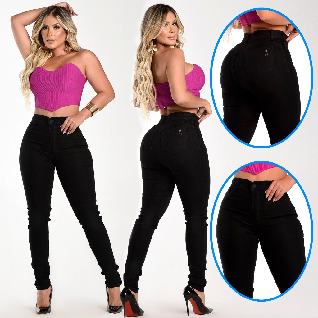 Calça Jeans Feminina Preta Skinny Lycra Cintura Alta Empina Bumbum Premium