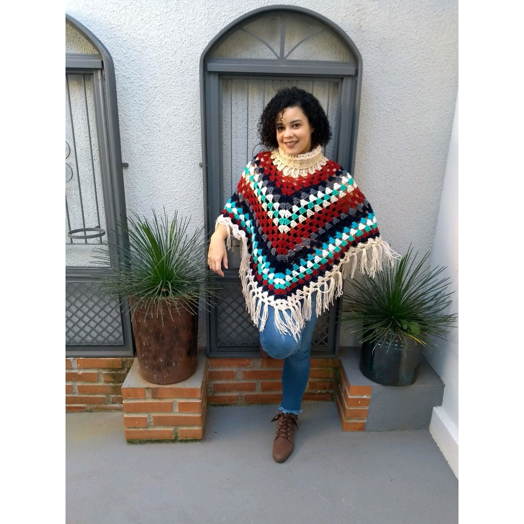 Poncho feminino de lã para inverno. Ponche de crochê tricot com franjas.