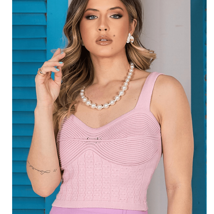 Cropped Feminino Detalhes no Busto Top Alcinha Canelado Tricot Blusa Estilosa Moda Verão Tricô