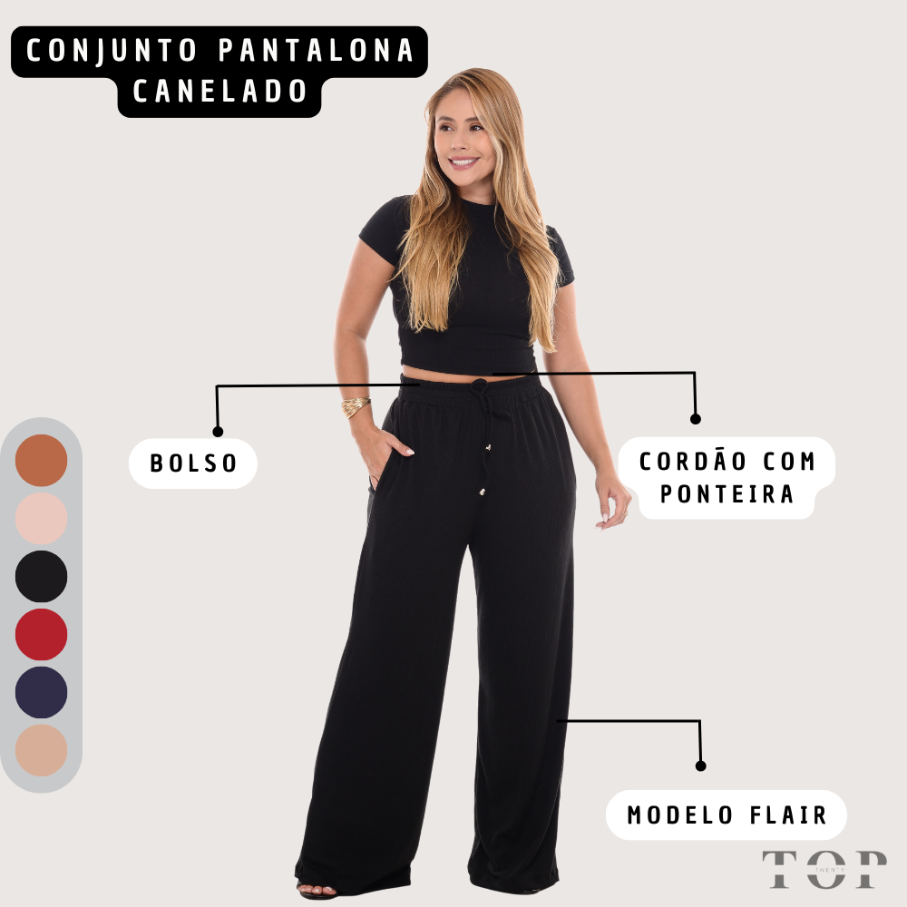 Conjunto Pantalona Feminina Canelada Com Bolso e Elástico na Cintura Blusa Gola Alta
