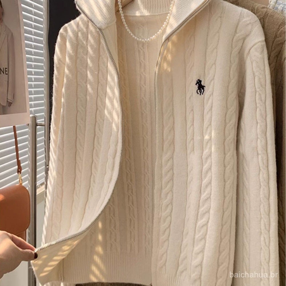 Jaqueta de linho com zíper francês com gola alta no outono e inverno, blusa de malha e cardigã feminino suéter preguiços