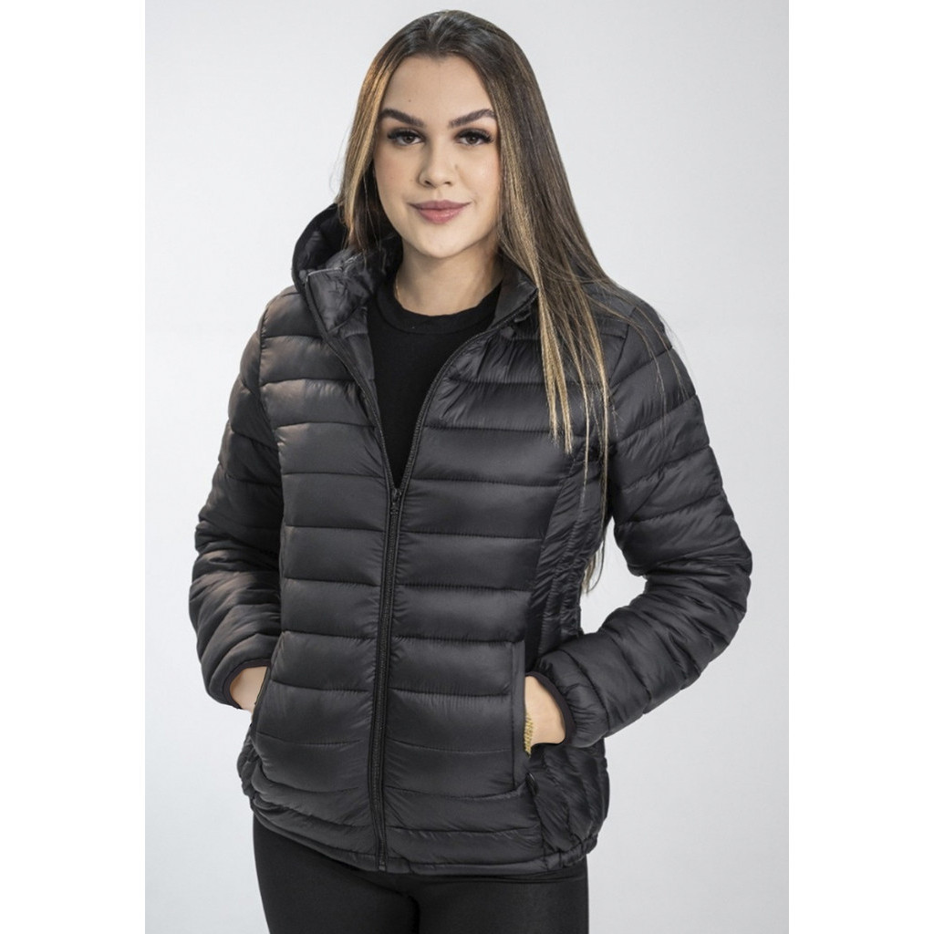 Jaqueta Puffer La'Oase Feminina Bobojaco com Bolsos e Capuz Removível Preto
