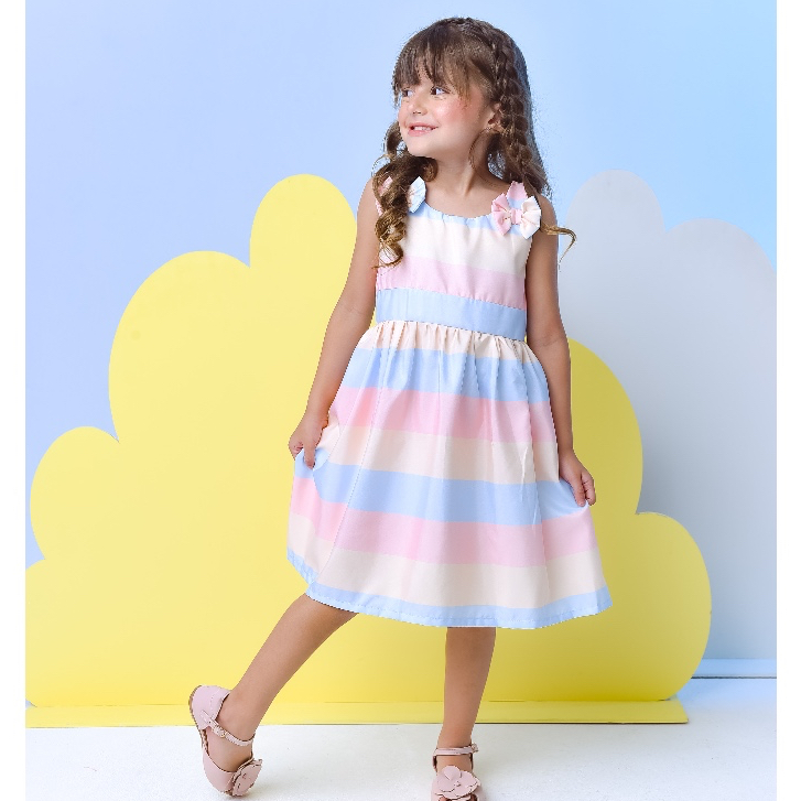 Vestido infantil Menina Moda Listrado Com Laço Ombro Rodado Princesa Festa Casual