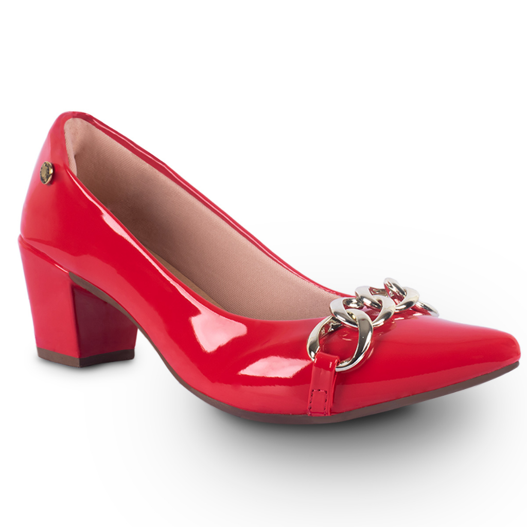 Scarpin Sapato Feminino Detalhe Corrente Dourada Salto Baixo Quadrado Bloco Bico Fino Promoção