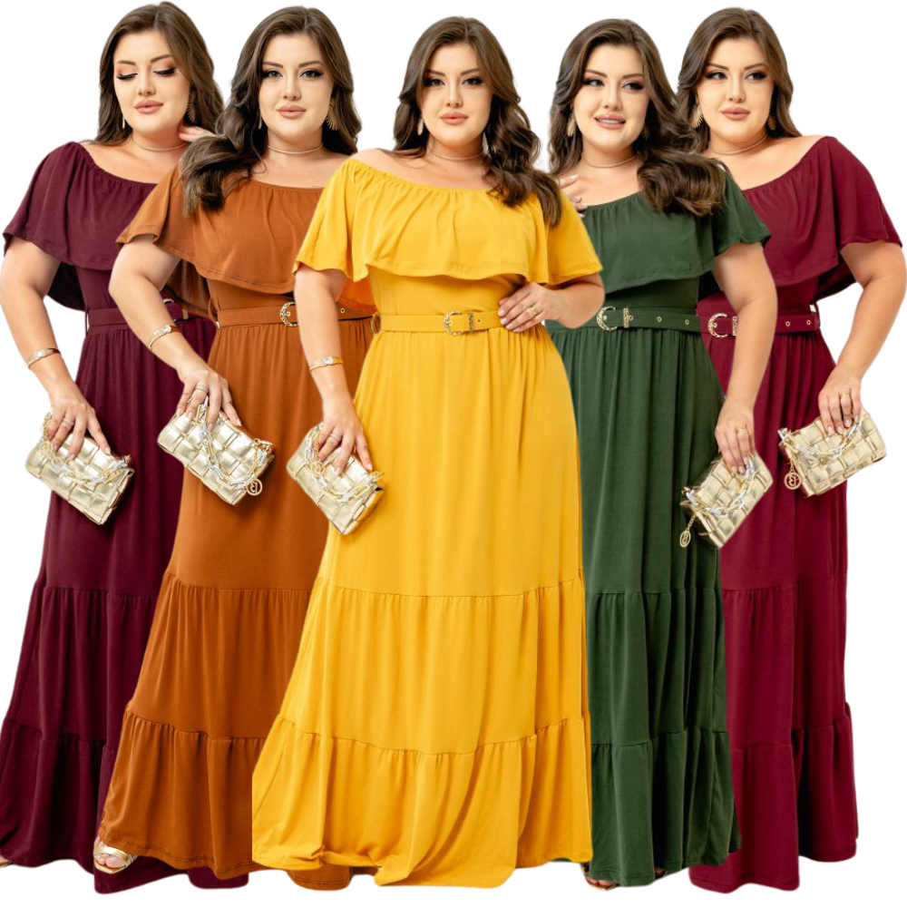 Vestido Longo Femino Ombro a Ombro Ciganinha Com Cinto Moda Evangelica Festa Elegante Plus Size Duas Marias