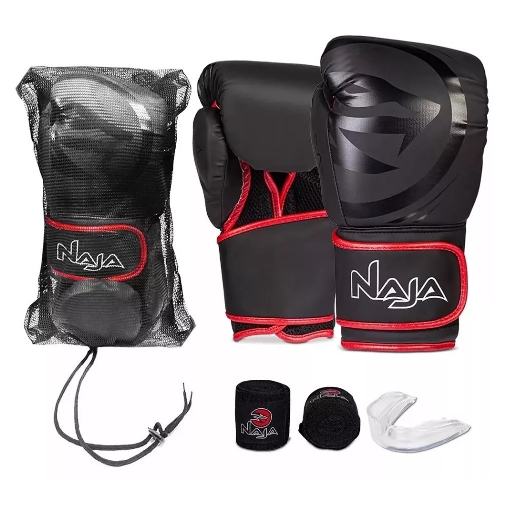 Kit Luva De Boxe E Muay Thai Naja Black Line + Bandagem + Protetor Bucal + Bolsa Bag