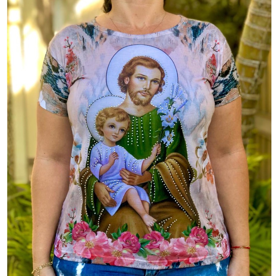 Blusa Baby Look Feminina de São José Camisa Religiosa Católica com pedrinhas strass