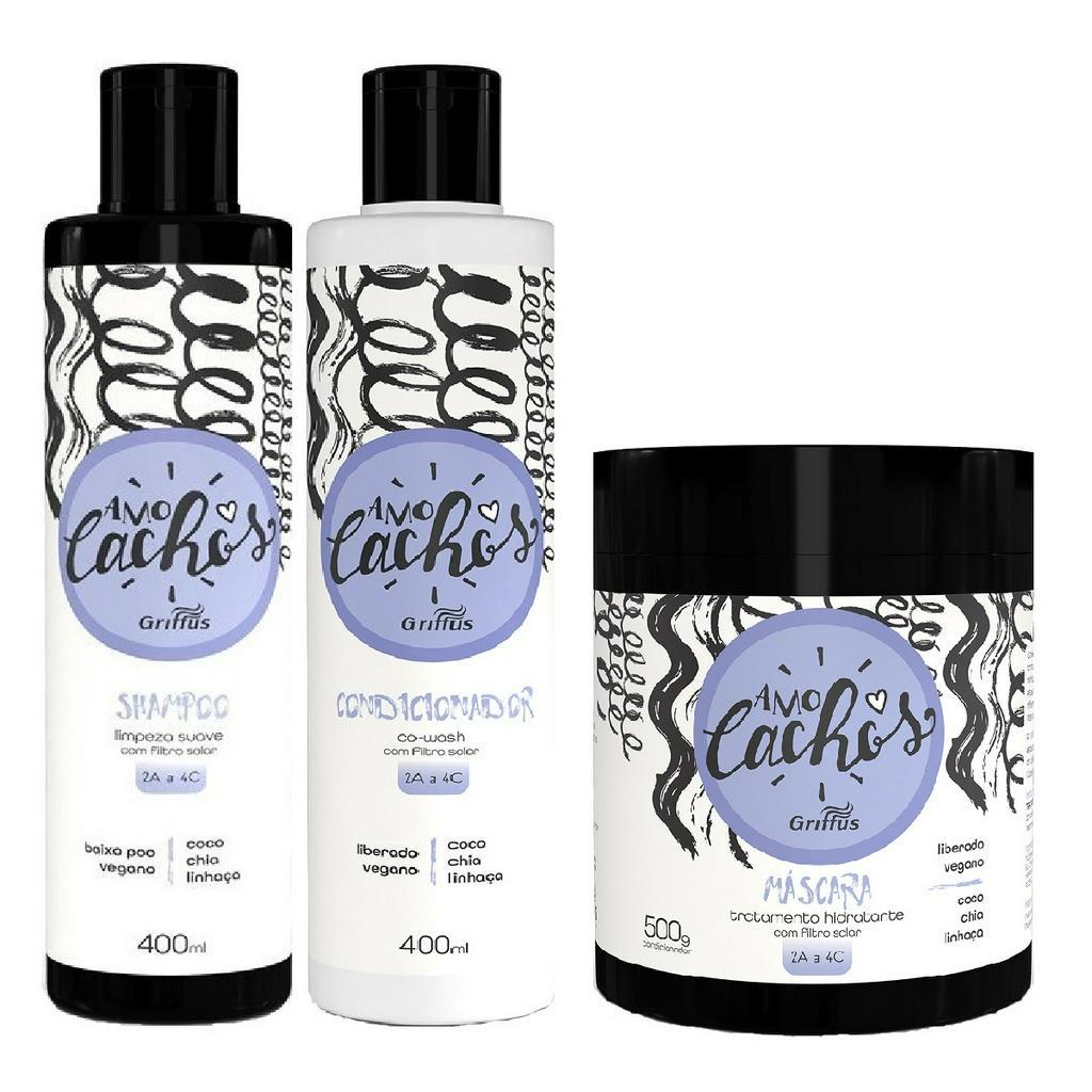 Kit Shampoo Baixo Poo + Condicionador Co-Wash + Máscara Coco, Chia e Linhaça 2A a 4C Vegano Amo Cachos Griffus