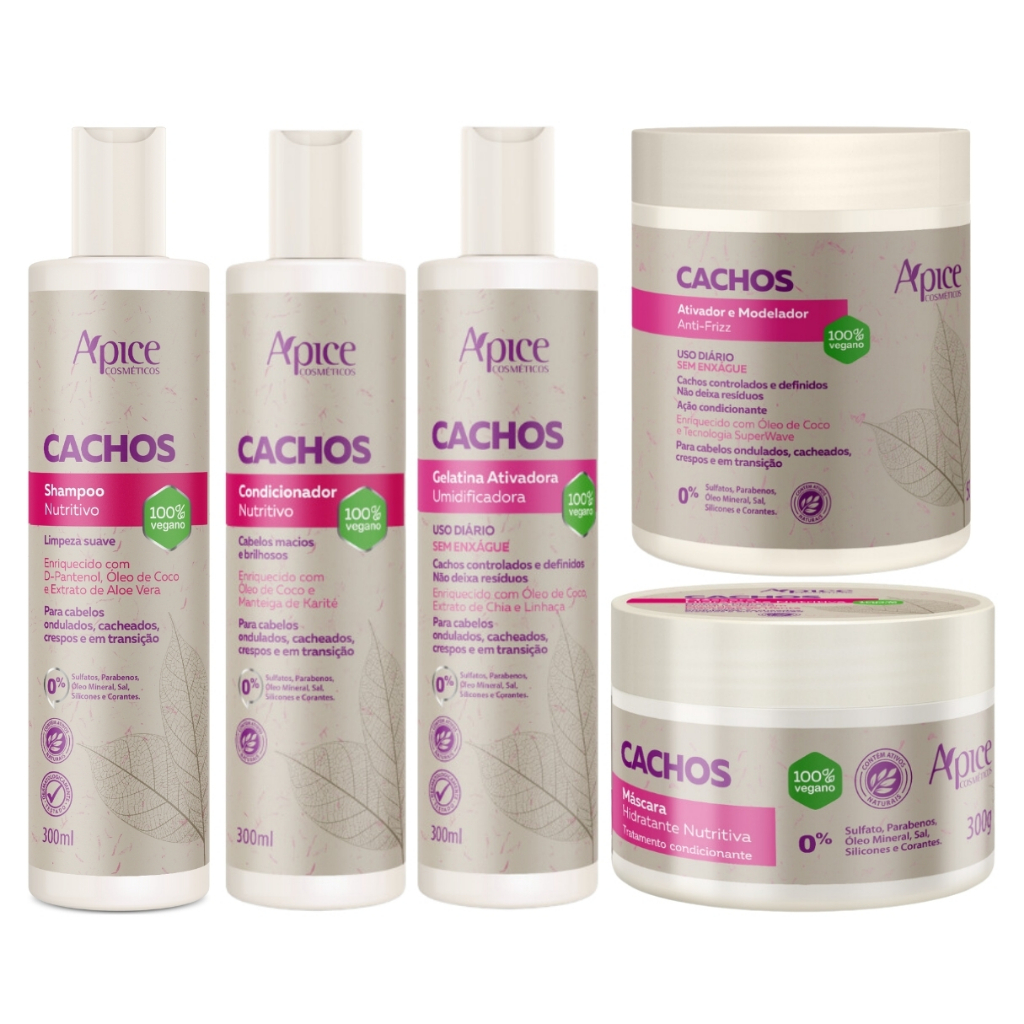 Kit Apse Cachos 5 Itens Tratamento Capilar Completo Cabelo Vegano Higienização Limpeza Finalização