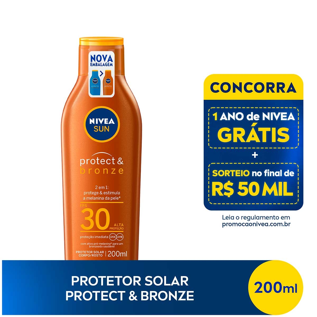 NIVEA SUN Protetor Solar Protect & Bronze FPS 30 200ml - Com ativo de pró melanina, resistente à água, protege dos raios UVA/UVB, ajuda a manter a cor bonita e uniforme por mais tempo, para um bronzeado saudável