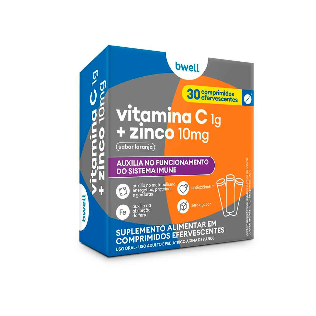 Vitamina C Efervescente 1g + Zinco 10mg bwell Sabor Laranja 30 comprimidos