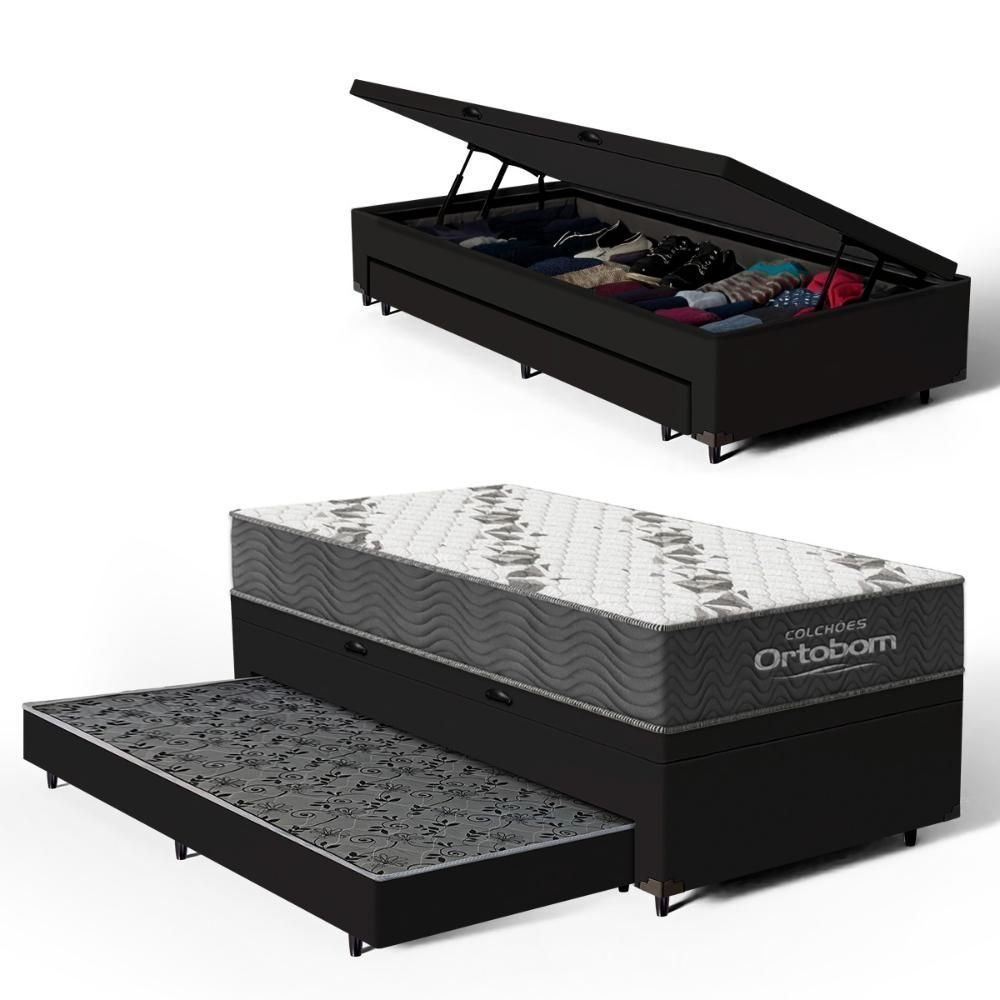 Cama Box Baú com Colchão de Espuma D33 Ortobom Airtech 100 + Auxiliar Unique Solteiro 88cm - Preto