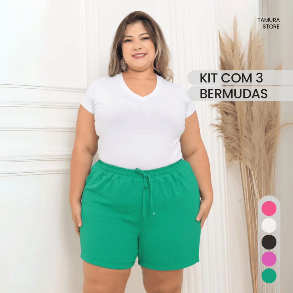 Kit 3 Bermuda Shorts Feminino Duna Confortável Saída Praia Plus Tecido Leve Preto Bege Verde