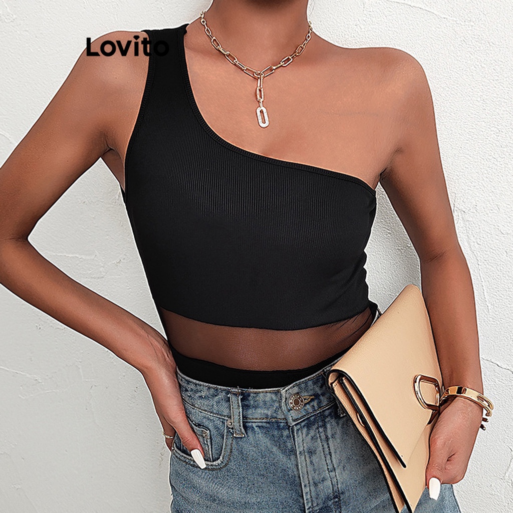 Lovito Body Sexy Liso De Ombro Frio Com Recorte De Malha Contrastante Para Mulheres LNE31181 (Preto)