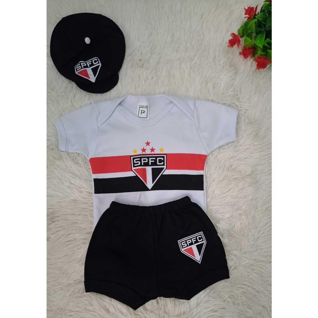 Body Bebê Futebol vermelho e branco – Kit 3 peças: Short/Shortinho + Boina (Menino)