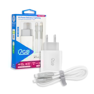 Kit Carregador de Parede Ultra Rápido com 1 Saída USB-C Power Delivery 20W + Cabo iPhone/Lightning + USB-C i2GO Certificado MFi 1,5m 3A Branco