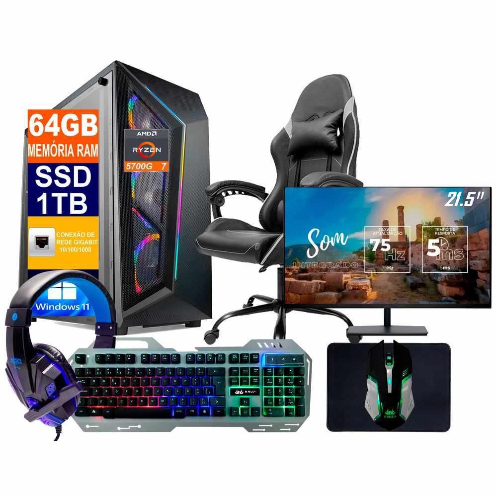 Computador Gamer Tech Power Shop Ryzen 7 5700g, 64GB RAM, DDR4, SSD 1TB Nvme M.2, Windows 11 Pro + Monitor 21.5", 75Hz + Teclado + Mouse + Headset + Cadeira Gamer