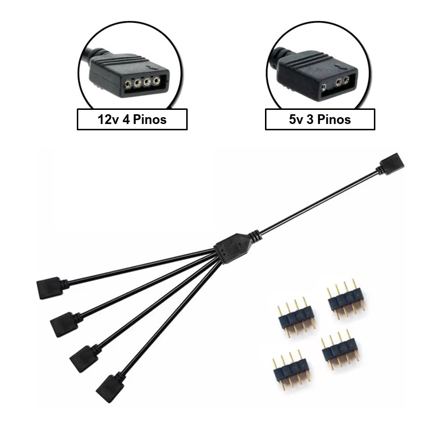 Cabo Splitter ARGB 5v 3 Pinos Macho e Fêmea 1 Entrada para 4 Saídas Cabo Led RGB 12v 4 Pinos